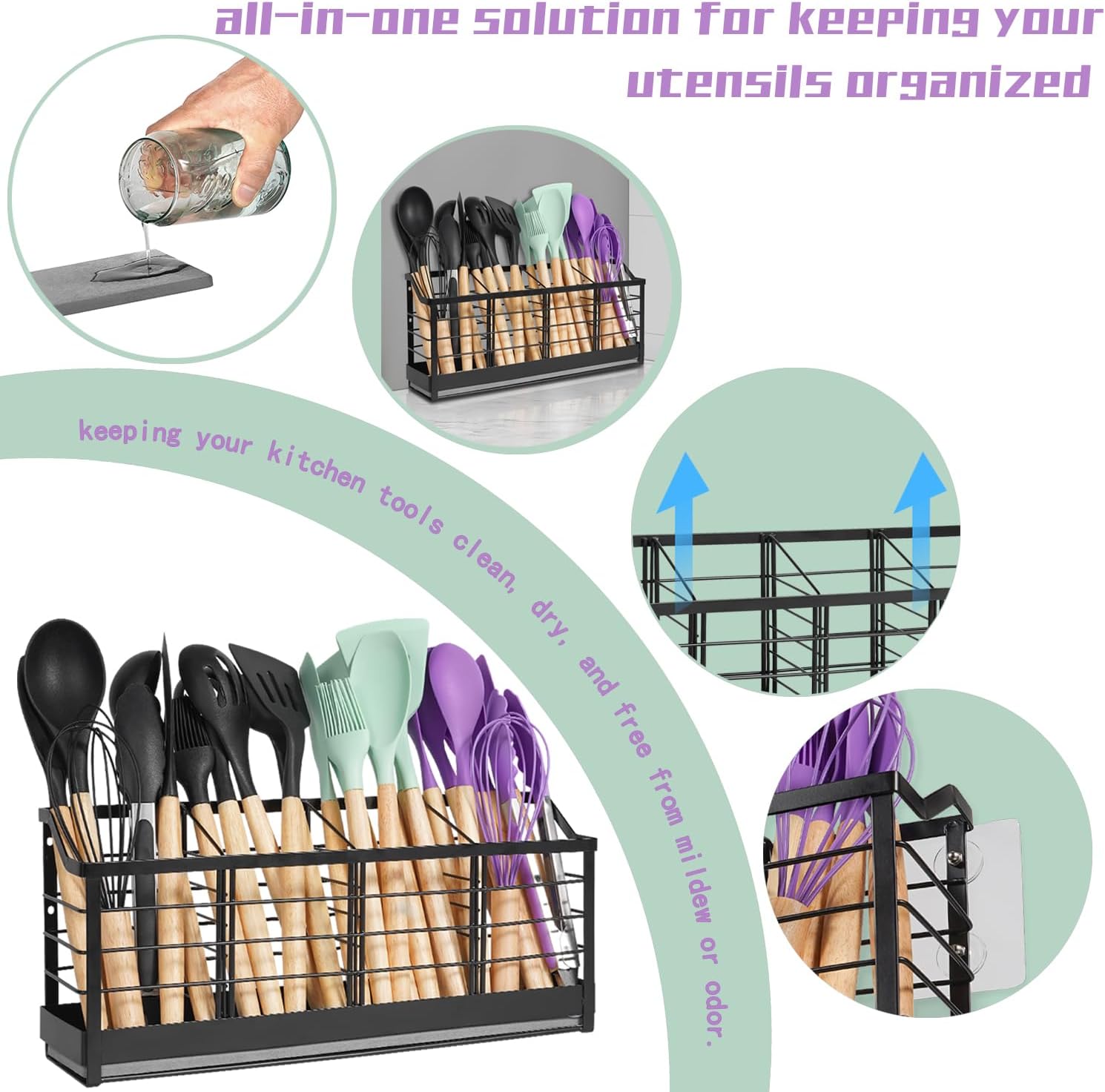 ✅ Product Description Upgrade your kitchen organization with this Extra Large Kitchen Utensil Holder, designed to blend functionality and elegance. Featuring a fast-drying diatomaceous earth base, this 4-compartment organizer keeps your cooking tools fresh and moisture-free. Whether you're storing spatulas, serving spoons, or tongs, the open metal frame promotes airflow and ensures quick drying. Built from heavy-duty, rust-resistant metal and finished in modern matte black, this utensil rack offers both durability and a sleek appearance. The sealed bottom prevents items from slipping through, while the 3.7 lb. weighted construction keeps it stable on any surface. Short on counter space? No problem. This caddy comes with dual wall-mounting options, making it easy to hang and keep your tools within reach without cluttering your workspace. Perfect for modern kitchens, minimalist setups, or busy family homes—this is the all-in-one solution for keeping your utensils organized, dry, and ready to use.