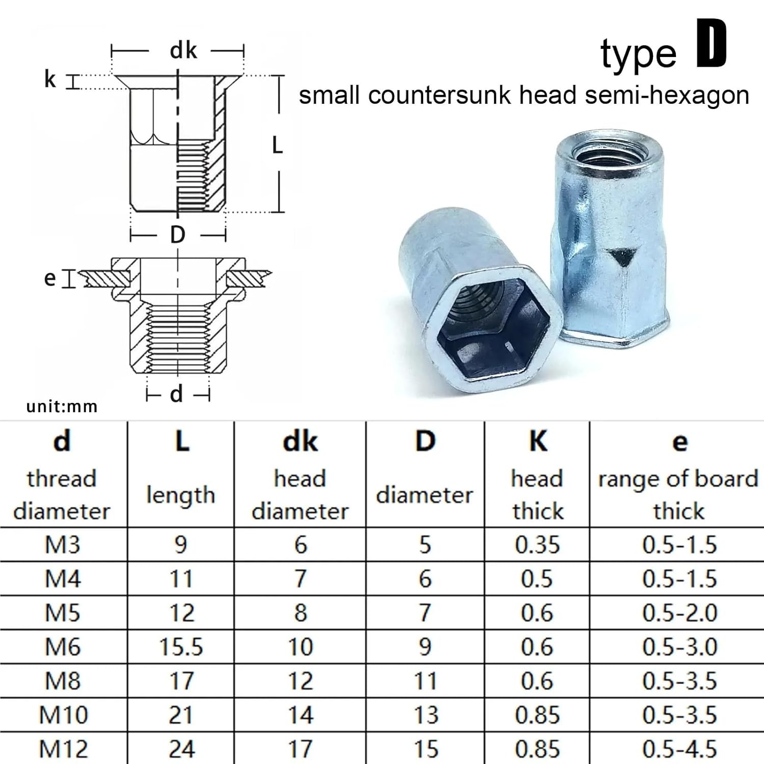 M3 Rivet Nut Thread Flat Head Small Countersunk Hexagon Steel 20/40/100Pcs(Type D,40pcs M3)
