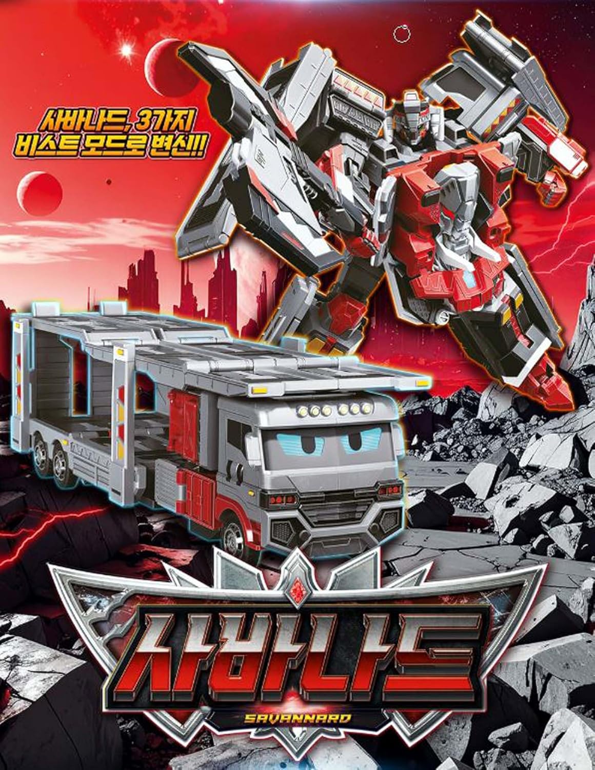 This New series Metal Cardbot W season 3 item is released at 2026 and SAVANNARD is Carrier Trailer Truck transforming Robot. SAVANNARD can be transformed to Robot mode and Vehicle(Carrier Truck) Mode Comes with SAVANNARD Metal Card and it can be transformed to weapon modes Can be transformed 3-Beast modes : Elephant, Giraffe and Zebra mode Included SAVANNARD, 2-Metal Cards, Manual Manual and Box are written in Korean language.