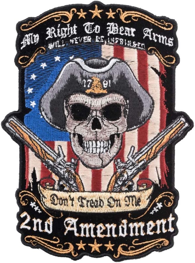 "MY RIGHT TO BEAR ARMS, WILL NEVER BE INFRINGED" embroidered in white atop a hatted skull with twin guns and an American Flag, with "DON'T TREAD ON ME, 2ND AMENDMENT," written on the bottom The 2nd Amendment Twin Guns Skull patch is available in 2 sizesMedium patch measures 4.25" W x 5.75" H (10.8cm x 14.6cm)X-Large patch measures 10" W x 13" H (25.4cm x 33cm)Embroidered with black outer border for easy sew on patch applicationIron on embroidered patch with heat seal backing for iron on or heat press applicationEmbroidered patches manufactured by PatchStop, The World's Largest Patch Store!