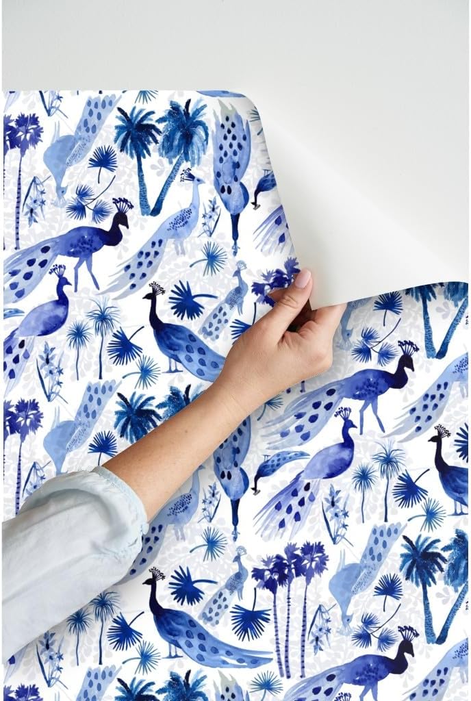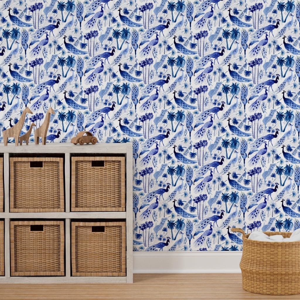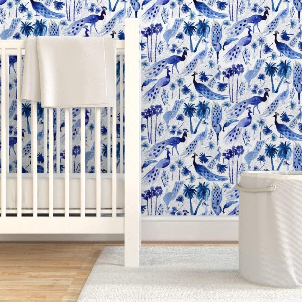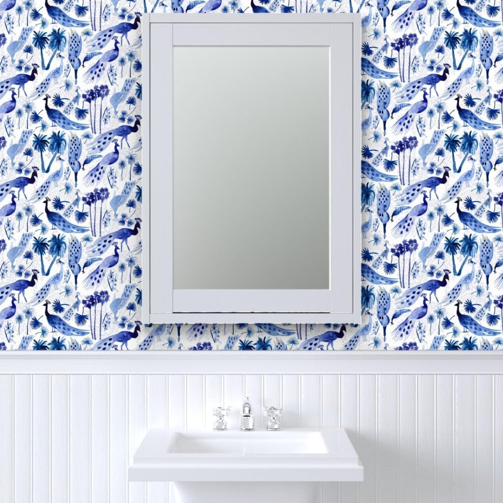 Peel & Stick Wallpaper 3ft x 2ft - Peacock Peacocks Bird Birds Animals Chinoiserie Blue White Trees Palm Nature Custom Removable Wallpaper by Spoonflower