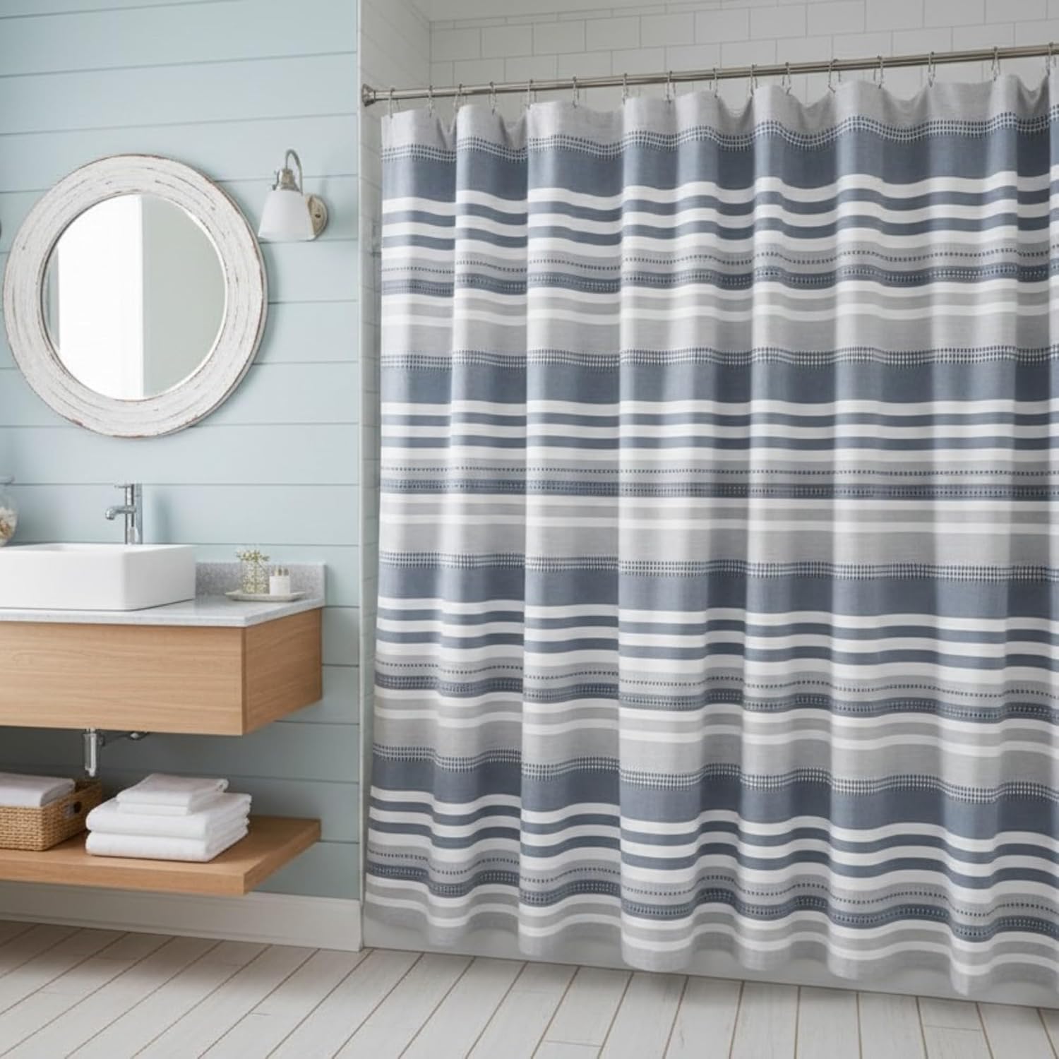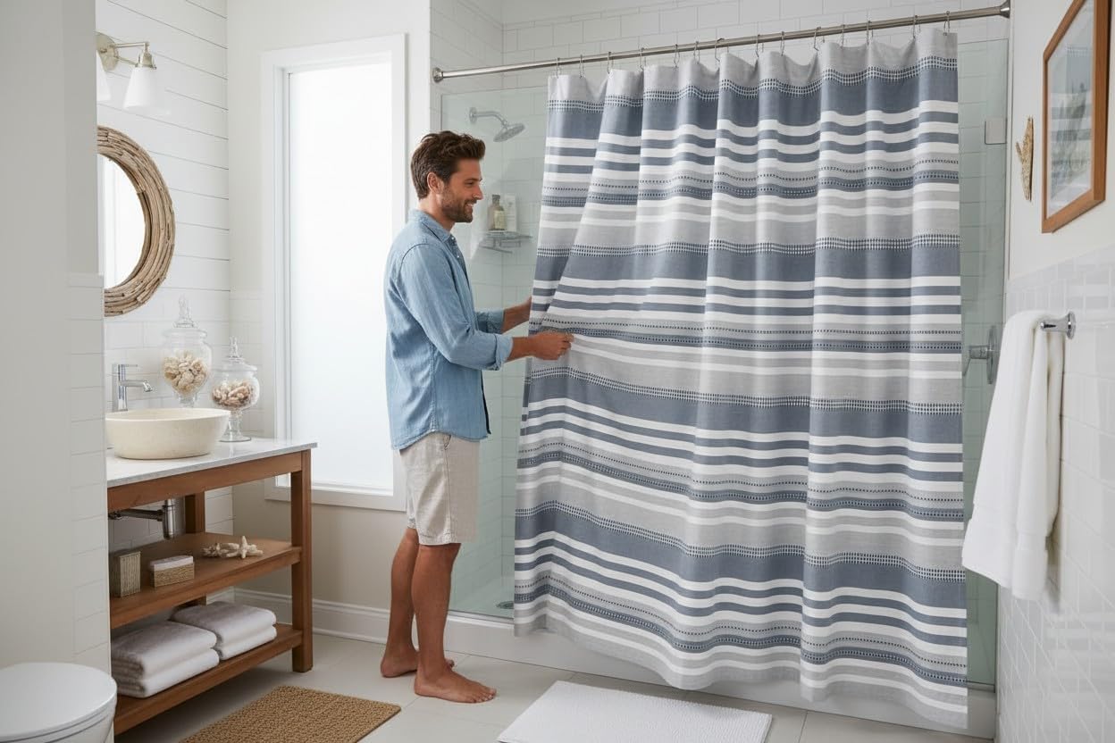 Transform your bathroom with this elegant coastal-inspired shower curtain featuring a sophisticated striped pattern in soothing blue, gray and white hues. Made from a cotton rich fabric blend of 80 percent cotton and 20 percent polyester, this fabric shower curtain offers a soft texture, breathable feel, and durable construction for everyday bathroom use. The decorative striped pattern adds texture and visual interest, creating a stylish bathroom shower curtain that complements nautical, beach modern, farmhouse, or spa inspired décor. Designed in a standard 72 x 72 shower curtain size, it fits most bathtubs and shower spaces while providing full coverage and privacy. The hook ready design with buttonholes allows easy installation with most standard shower curtain hooks or rings. Machine washable for easy care, this durable fabric shower curtain helps maintain a clean and fresh bathroom environment. For best performance, use with a shower curtain liner to help keep water inside the shower area.