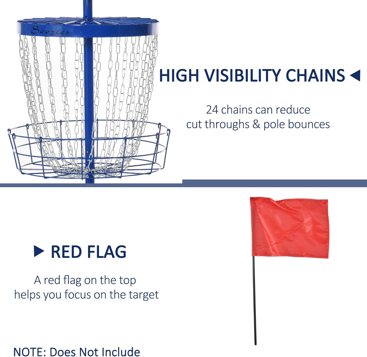 Description:Soozier Portable Disc Golf Basket Target with 24-Chain, Travel Bag, Dark BlueFeatures:- This disc golf basket lets you play a fun game with family and friends - Water safe powder coated steel frame - An easy-to-see flag and high visibility chains to make long-distance putting easier - 24 dense chains prevent your disc from falling out - Easy to set up and disassemble into a flat and compact size when not in use - A bag is included for storage and transport - NOTE: Does not include golf discs Specifications:- Color: Deep Blue - Material: Steel - Overall Dimensions: 24.75" Dia x 63.75" H - Round Steel Pan Size: 21.5" (Top), 24.75" (Middle), 21.25" (Bottom) - Height of the Chain: 24.5" H - Item Label: A71-019BU Package Includes:- 1 x Disc Golf Basket Target - 1 x Red Flag - 1 x Carry Bag - 1 x Manual