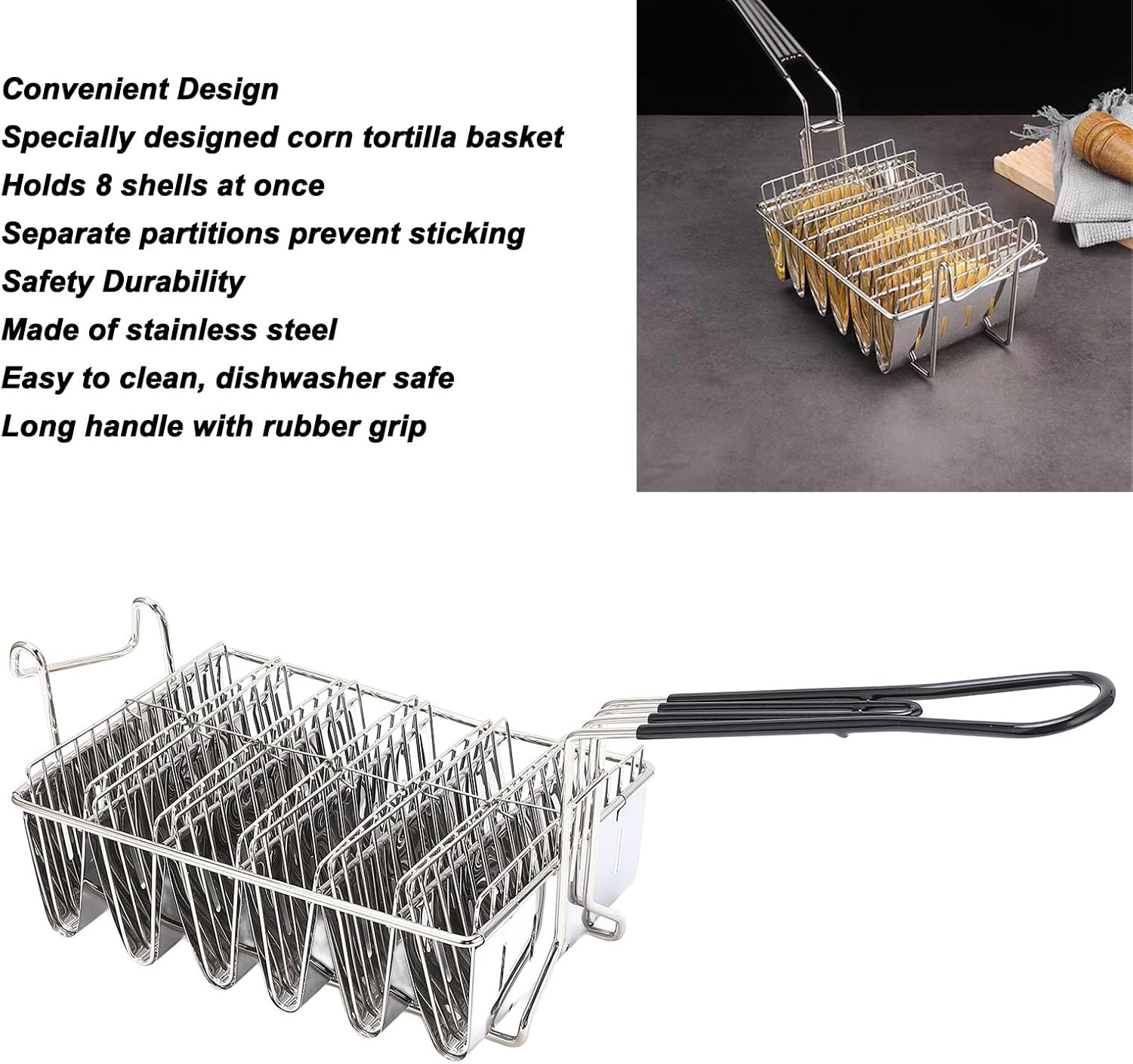 Item Type: Taco Fryer Material: Stainless steel, Rubber Grip Package List: 1 x Taco Fryer 6 x Shaping Rack