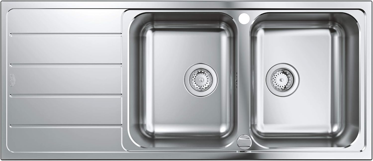 Choose a kitchen sink built to last, offering flexibility, convenience and practical functions. The GROHE K500 stainless steel sink with draining board is completely reversible thanks to the two pre-drilled tap holes. Both buckets have a generous depth of 18.5 cm, thanks to which large pans fit into this sink. GROHE Whisper insulation on the bottom side reduces noise, and thanks to the remote-controlled automatic drain attachment you will never have to put your hand into dirty water to remove the plug. Made from robust AISI 304 grade GROHE StarLight stainless steel, the brushed finish reduces surface porosity and makes cleaning easier so that it maintains its flawless look for longer. Thanks to the GROHE QuickFix system, this sink can be installed quickly and without the hassle of additional equipment. Choose from the classic 8mm profile countertop installation or flush mount with a 1.5mm rabbet ideal for flush fitting countertop. GROHE K500 stainless steel sinks - quality and style at a sensational price. Model: K500 80-S 116/50 2.0 rev Mounting Type: On Countertop or Flush Mount Material: Stainless Steel AISI 304 (V2A) Material Thickness: 0.7mm GROHE StarLight Chrome Finish Satin Finish GROHE Whisper Noise Damper Measurement MIN Cabinet: 800 mm Dimensions: 1160 x 500 mm 1 bucket: 340 x 420 x 190 mm 2 bucket: 340 x 420 x 190 mm External radius: R6 internal radius: R90 GROUND HE QuickFix Quick Installation System Reversible Measurement Worktop Cut (on Countertop): 1140 x 480 mm Automatic Valve Includes: Automatic Drain, Siphon, Basket and Mounting Set