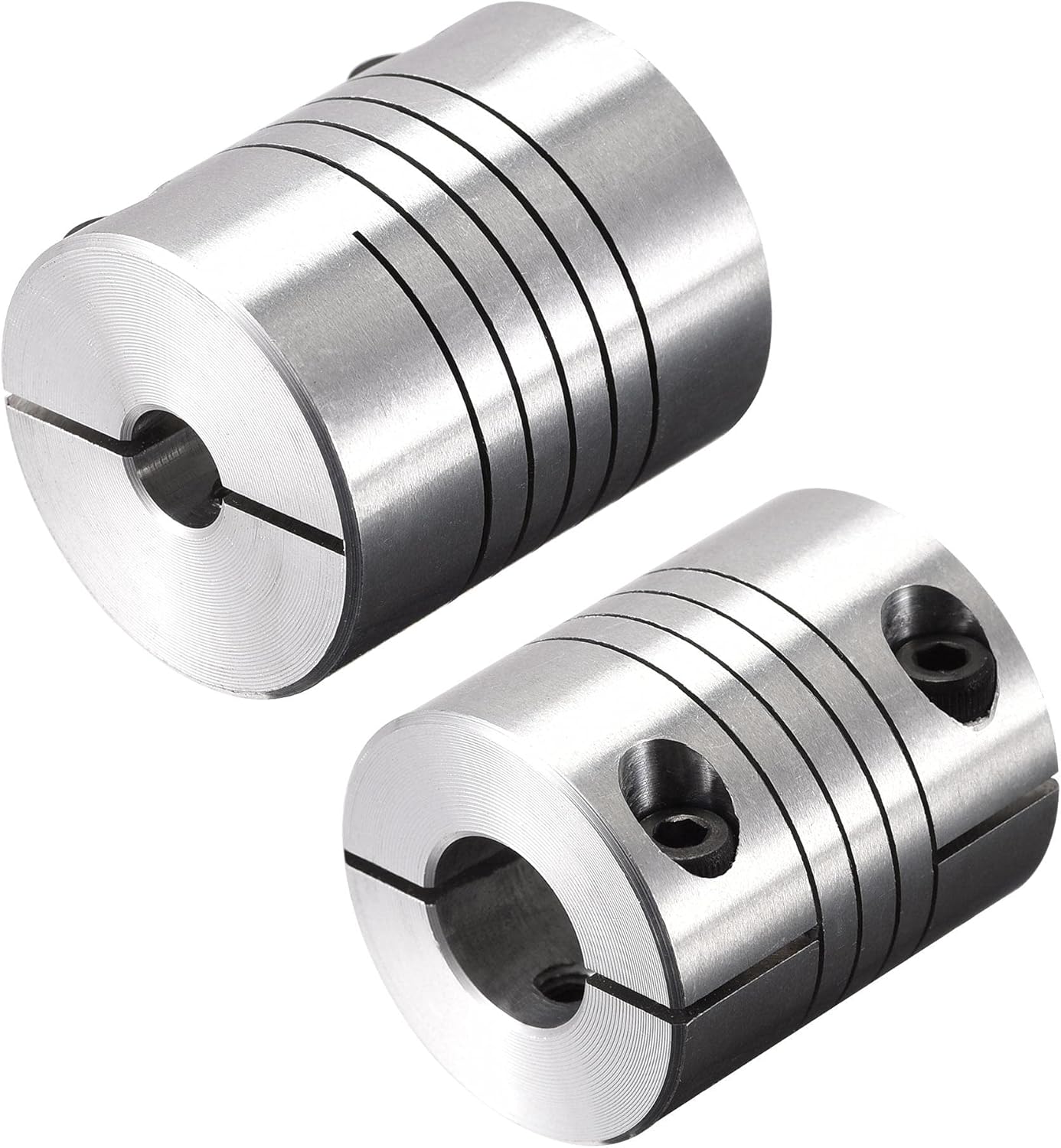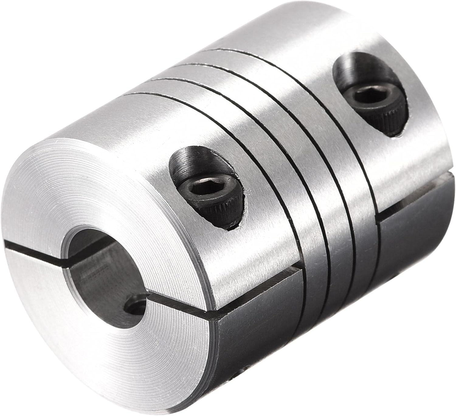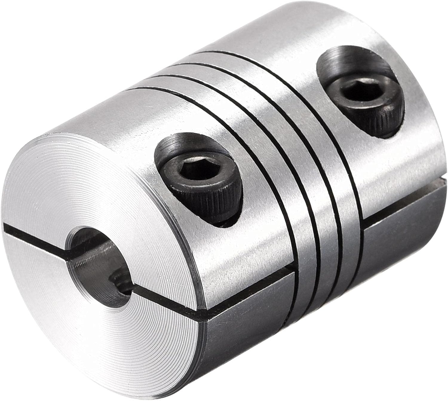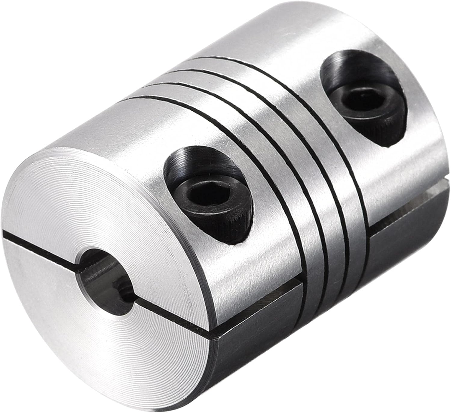 Zero backlash. Two-piece metallic spring coupling. For little torque shaft connect.Absorption of parallel, angular misalignments and shaft end-play by spring action.Widely used in drive systems for encoders, instrumentation,lead screws, small pumps, feed rollers and anywhere light to medium duty, torsionally flexible coupling is required. Specification:Color: Silver ToneMaterial: Aluminum AlloyConnection Diameter: 6.35mm to 11mmScrew Angle: 90 degreeTotal Length: 30mm /1.18 inchOutside Diameter : 25mm /0.98 inch Package Content:1 x Shaft coupling
