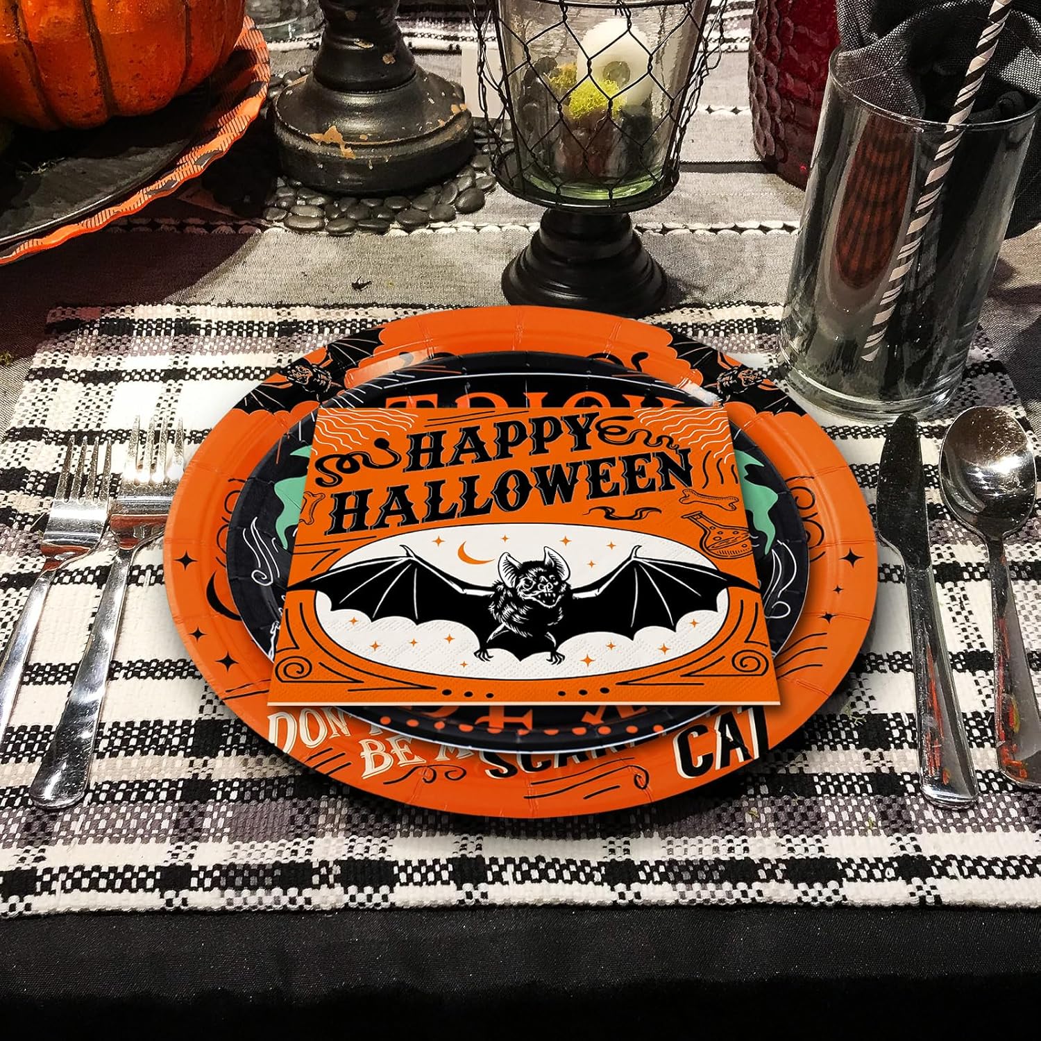 Features & Benefits: Our tableware set are printed with pumpkin, bat and black cat patterns, classic and exquisite, will offer you a comfortable using and convenient cleanup experience. Disposable tableware set not only practical for holding food and entertaining guests, but also for decorations with a sense of design in various parties. Specifications: Material: Paper Package includes: 48 × Paper Plates 24 × Paper Napkins