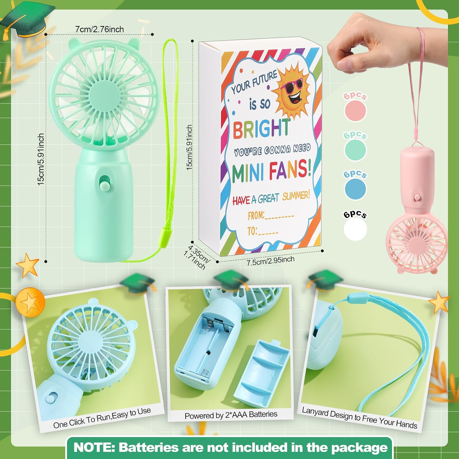 Features: Beyond the ceremony: this gift has a long lifespan. The fan is ideal for future days, internships, travel, and more, constantly reminding them of your support. Specifications: Material: plastic Color: macaron Colors Size: 5.9"x2.8"x1.8" Package includes: 24 x Mini fan 24 x Graduation gift box Notes: Manual measurement, please allow slight errors on size. The color may exist a slight difference due to different screen displays.